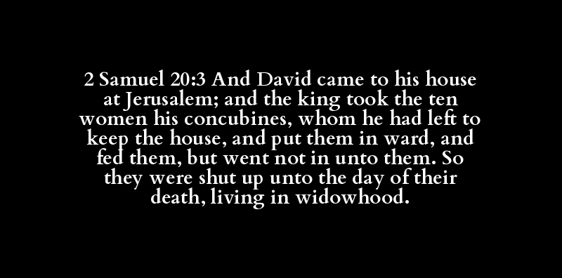 2 Samuel 20:3 And David came to his house at Jerusalem; and the king took the ten women his concubines, whom he had left to keep the house, and put them in ward, and fed them, but went not in unto them. So they were shut up unto the day of their death, living in widowhood.