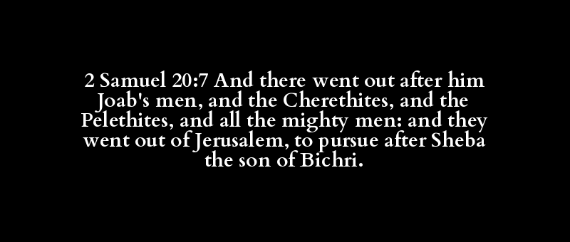 2 Samuel 20:7 And there went out after him Joab's men, and the Cherethites, and the Pelethites, and all the mighty men: and they went out of Jerusalem, to pursue after Sheba the son of Bichri.