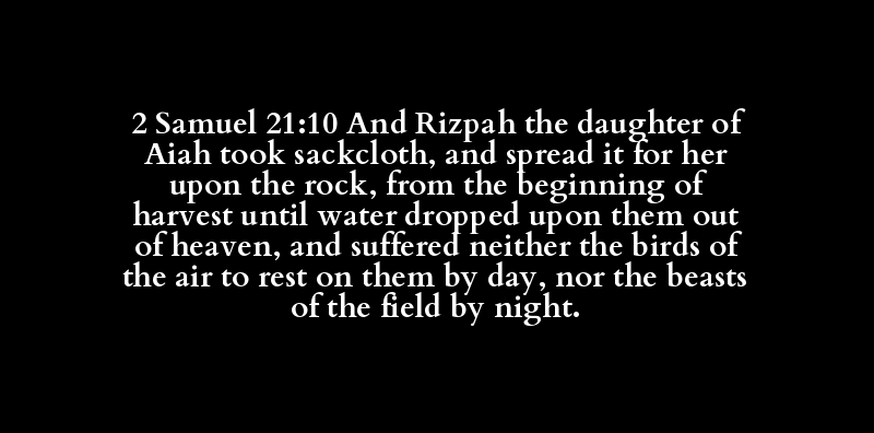 2 Samuel 21:10 And Rizpah the daughter of Aiah took sackcloth, and spread it for her upon the rock, from the beginning of harvest until water dropped upon them out of heaven, and suffered neither the birds of the air to rest on them by day, nor the beasts of the field by night.