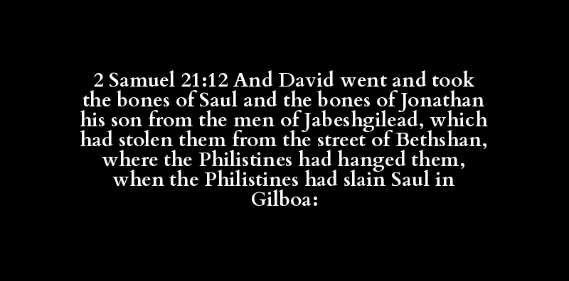 2 Samuel 21:12 And David went and took the bones of Saul and the bones of Jonathan his son from the men of Jabeshgilead, which had stolen them from the street of Bethshan, where the Philistines had hanged them, when the Philistines had slain Saul in Gilboa: