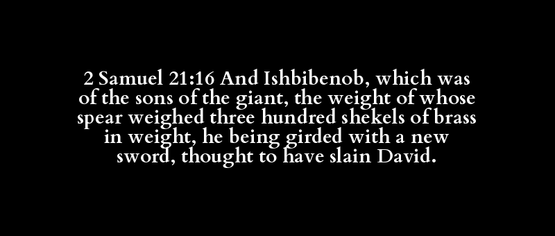 2 Samuel 21:16 And Ishbibenob, which was of the sons of the giant, the weight of whose spear weighed three hundred shekels of brass in weight, he being girded with a new sword, thought to have slain David.