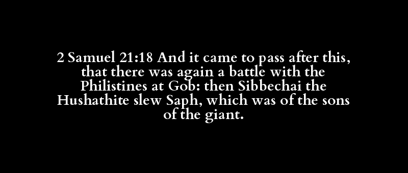 2 Samuel 21:18 And it came to pass after this, that there was again a battle with the Philistines at Gob: then Sibbechai the Hushathite slew Saph, which was of the sons of the giant.
