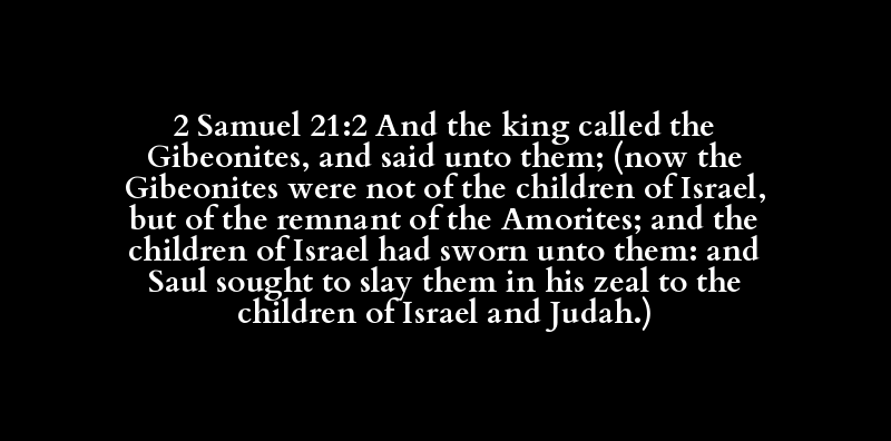 2 Samuel 21:2 And the king called the Gibeonites, and said unto them; (now the Gibeonites were not of the children of Israel, but of the remnant of the Amorites; and the children of Israel had sworn unto them: and Saul sought to slay them in his zeal to the children of Israel and Judah.)