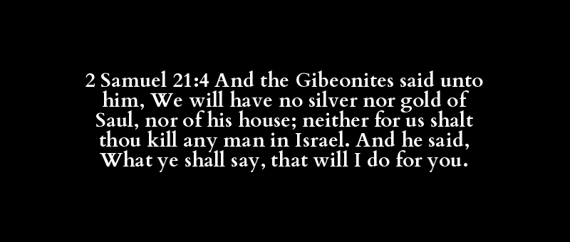 2 Samuel 21:4 And the Gibeonites said unto him, We will have no silver nor gold of Saul, nor of his house; neither for us shalt thou kill any man in Israel. And he said, What ye shall say, that will I do for you.