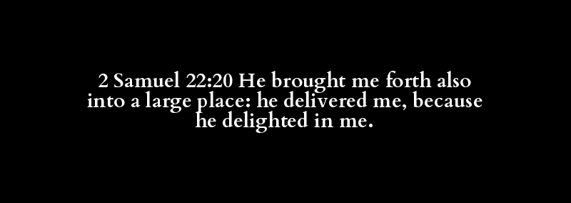 2 Samuel 22:20 He brought me forth also into a large place: he delivered me, because he delighted in me.