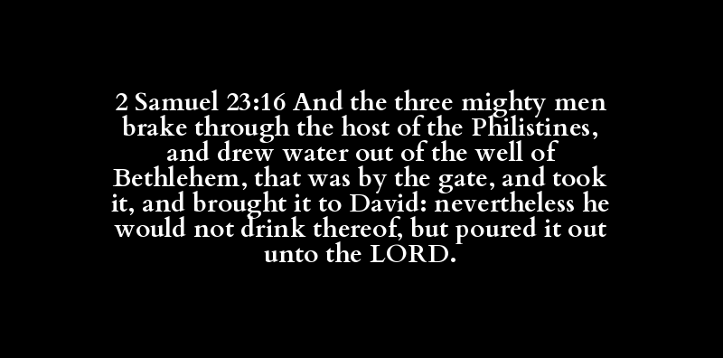2 Samuel 23:16 And the three mighty men brake through the host of the Philistines, and drew water out of the well of Bethlehem, that was by the gate, and took it, and brought it to David: nevertheless he would not drink thereof, but poured it out unto the LORD.