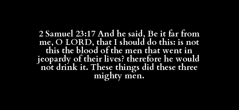 2 Samuel 23:17 And he said, Be it far from me, O LORD, that I should do this: is not this the blood of the men that went in jeopardy of their lives? therefore he would not drink it. These things did these three mighty men.