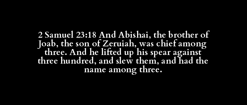 2 Samuel 23:18 And Abishai, the brother of Joab, the son of Zeruiah, was chief among three. And he lifted up his spear against three hundred, and slew them, and had the name among three.