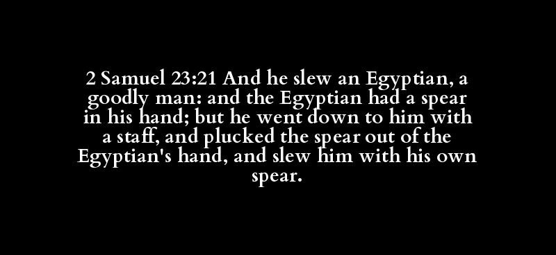 2 Samuel 23:21 And he slew an Egyptian, a goodly man: and the Egyptian had a spear in his hand; but he went down to him with a staff, and plucked the spear out of the Egyptian's hand, and slew him with his own spear.