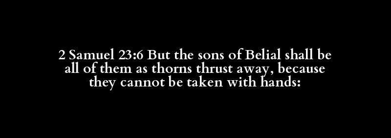 2 Samuel 23:6 But the sons of Belial shall be all of them as thorns thrust away, because they cannot be taken with hands: