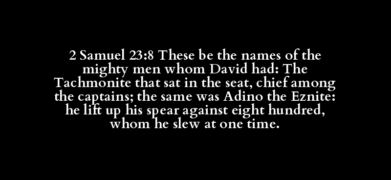 2 Samuel 23:8 These be the names of the mighty men whom David had: The Tachmonite that sat in the seat, chief among the captains; the same was Adino the Eznite: he lift up his spear against eight hundred, whom he slew at one time.