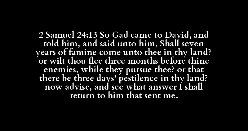 2 Samuel 24:13 So Gad came to David, and told him, and said unto him, Shall seven years of famine come unto thee in thy land? or wilt thou flee three months before thine enemies, while they pursue thee? or that there be three days' pestilence in thy land? now advise, and see what answer I shall return to him that sent me.