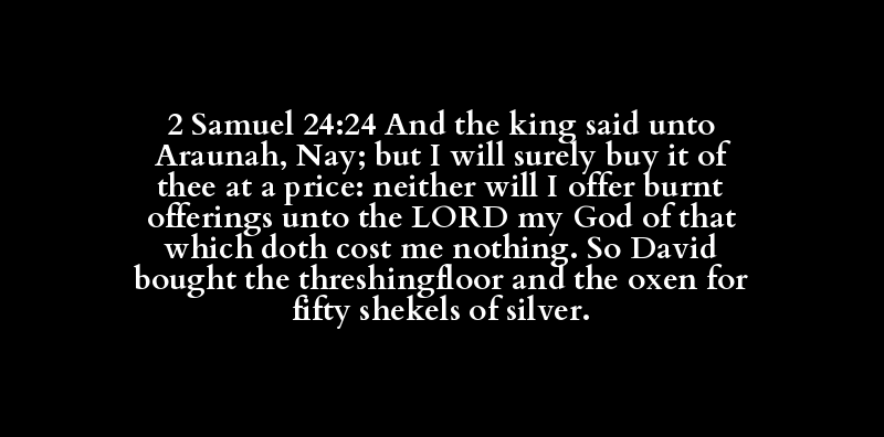 2 Samuel 24:24 And the king said unto Araunah, Nay; but I will surely buy it of thee at a price: neither will I offer burnt offerings unto the LORD my God of that which doth cost me nothing. So David bought the threshingfloor and the oxen for fifty shekels of silver.
