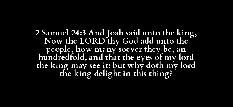 2 Samuel 24:3 And Joab said unto the king, Now the LORD thy God add unto the people, how many soever they be, an hundredfold, and that the eyes of my lord the king may see it: but why doth my lord the king delight in this thing?
