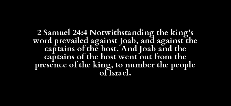 2 Samuel 24:4 Notwithstanding the king's word prevailed against Joab, and against the captains of the host. And Joab and the captains of the host went out from the presence of the king, to number the people of Israel.