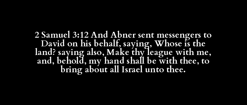 2 Samuel 3:12 And Abner sent messengers to David on his behalf, saying, Whose is the land? saying also, Make thy league with me, and, behold, my hand shall be with thee, to bring about all Israel unto thee.