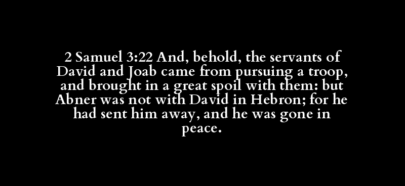 2 Samuel 3:22 And, behold, the servants of David and Joab came from pursuing a troop, and brought in a great spoil with them: but Abner was not with David in Hebron; for he had sent him away, and he was gone in peace.