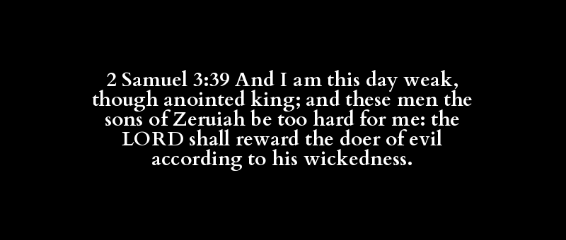 2 Samuel 3:39 And I am this day weak, though anointed king; and these men the sons of Zeruiah be too hard for me: the LORD shall reward the doer of evil according to his wickedness.