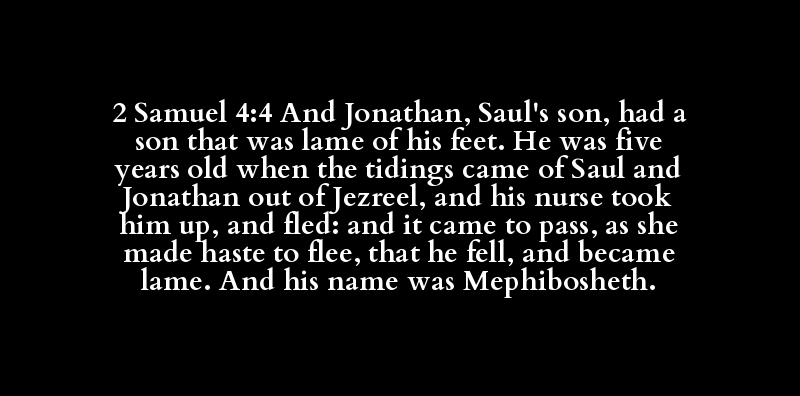 2 Samuel 4:4 And Jonathan, Saul's son, had a son that was lame of his feet. He was five years old when the tidings came of Saul and Jonathan out of Jezreel, and his nurse took him up, and fled: and it came to pass, as she made haste to flee, that he fell, and became lame. And his name was Mephibosheth.