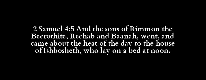 2 Samuel 4:5 And the sons of Rimmon the Beerothite, Rechab and Baanah, went, and came about the heat of the day to the house of Ishbosheth, who lay on a bed at noon.