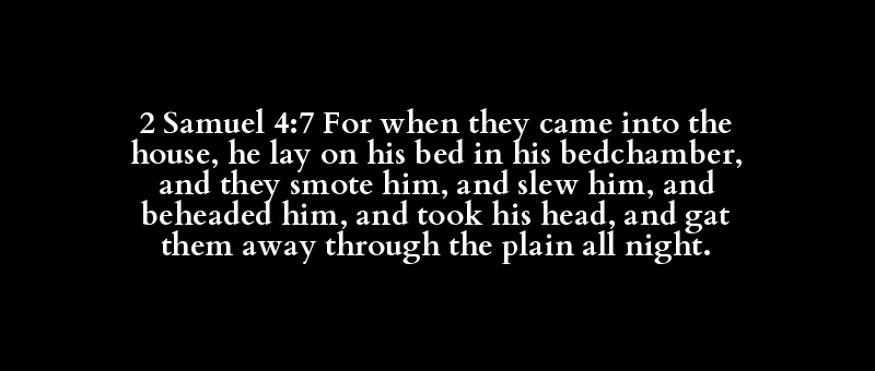 2 Samuel 4:7 For when they came into the house, he lay on his bed in his bedchamber, and they smote him, and slew him, and beheaded him, and took his head, and gat them away through the plain all night.
