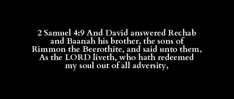 2 Samuel 4:9 And David answered Rechab and Baanah his brother, the sons of Rimmon the Beerothite, and said unto them, As the LORD liveth, who hath redeemed my soul out of all adversity,