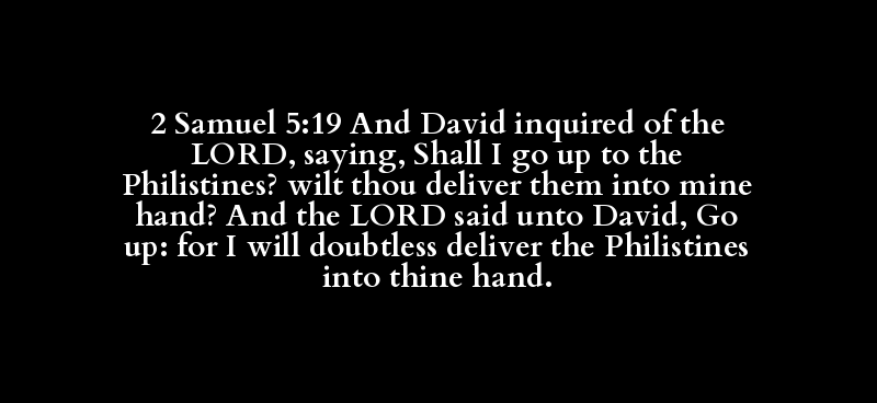 2 Samuel 5:19 And David inquired of the LORD, saying, Shall I go up to the Philistines? wilt thou deliver them into mine hand? And the LORD said unto David, Go up: for I will doubtless deliver the Philistines into thine hand.