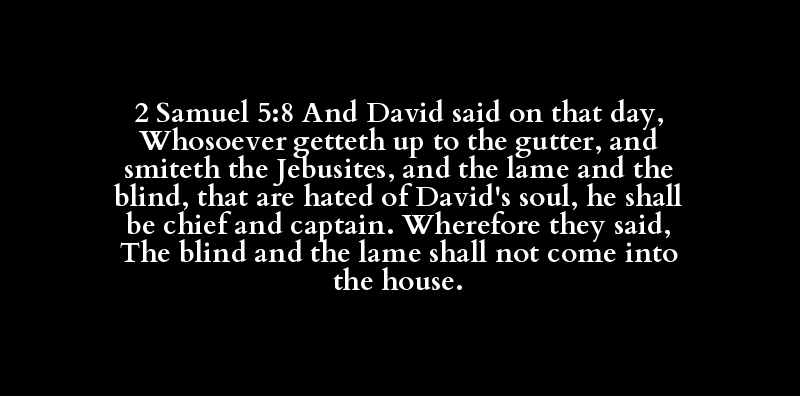 2 Samuel 5:8 And David said on that day, Whosoever getteth up to the gutter, and smiteth the Jebusites, and the lame and the blind, that are hated of David's soul, he shall be chief and captain. Wherefore they said, The blind and the lame shall not come into the house.