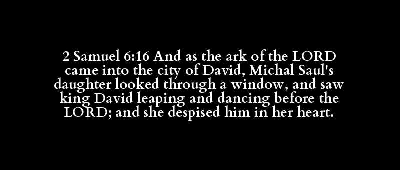 2 Samuel 6:16 And as the ark of the LORD came into the city of David, Michal Saul's daughter looked through a window, and saw king David leaping and dancing before the LORD; and she despised him in her heart.
