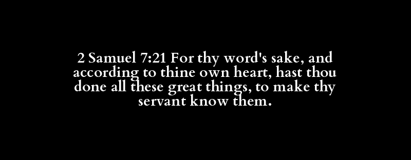 2 Samuel 7:21 For thy word's sake, and according to thine own heart, hast thou done all these great things, to make thy servant know them.