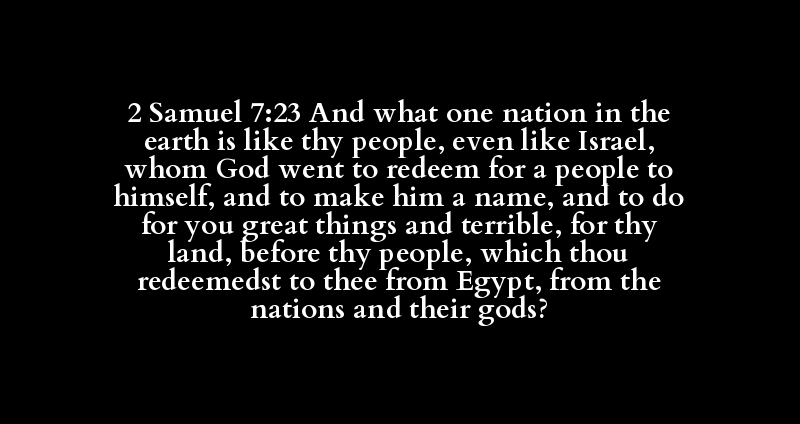 2 Samuel 7:23 And what one nation in the earth is like thy people, even like Israel, whom God went to redeem for a people to himself, and to make him a name, and to do for you great things and terrible, for thy land, before thy people, which thou redeemedst to thee from Egypt, from the nations and their gods?