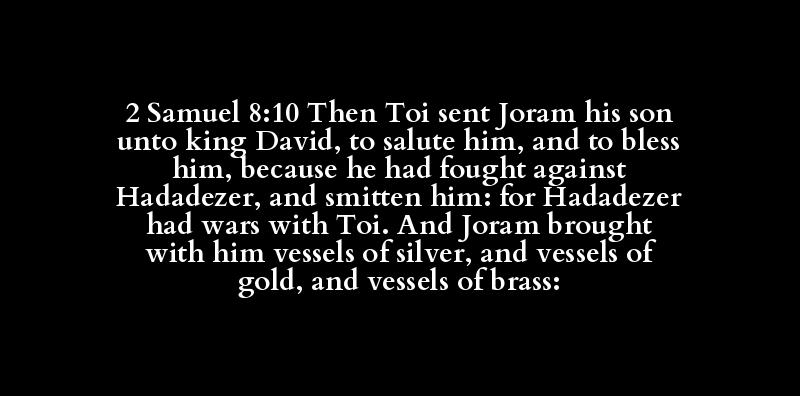 2 Samuel 8:10 Then Toi sent Joram his son unto king David, to salute him, and to bless him, because he had fought against Hadadezer, and smitten him: for Hadadezer had wars with Toi. And Joram brought with him vessels of silver, and vessels of gold, and vessels of brass: