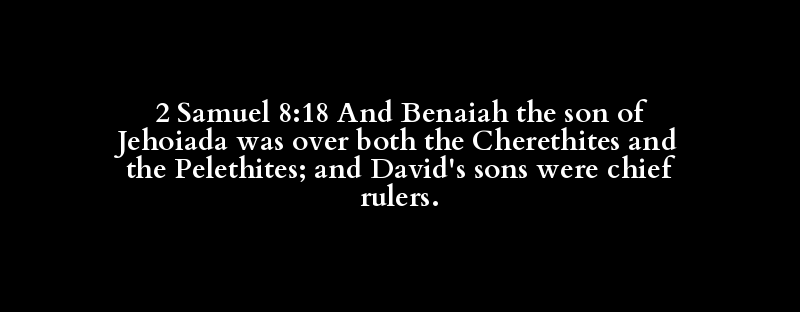 2 Samuel 8:18 And Benaiah the son of Jehoiada was over both the Cherethites and the Pelethites; and David's sons were chief rulers.