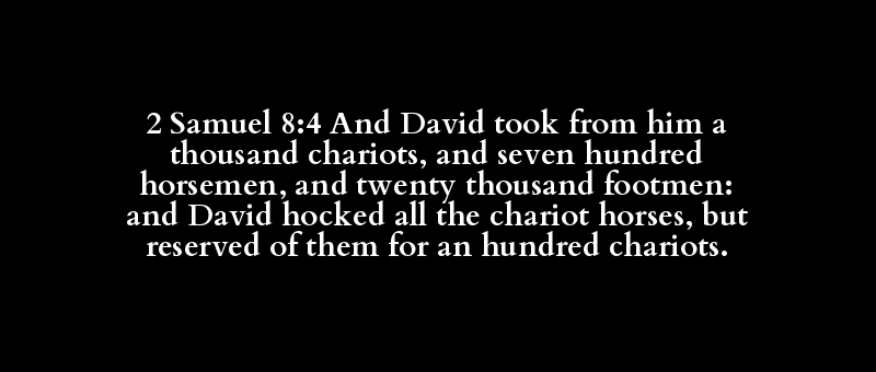2 Samuel 8:4 And David took from him a thousand chariots, and seven hundred horsemen, and twenty thousand footmen: and David hocked all the chariot horses, but reserved of them for an hundred chariots.