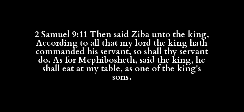 2 Samuel 9:11 Then said Ziba unto the king, According to all that my lord the king hath commanded his servant, so shall thy servant do. As for Mephibosheth, said the king, he shall eat at my table, as one of the king's sons.
