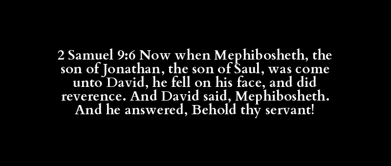 2 Samuel 9:6 Now when Mephibosheth, the son of Jonathan, the son of Saul, was come unto David, he fell on his face, and did reverence. And David said, Mephibosheth. And he answered, Behold thy servant!
