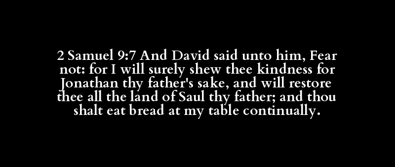 2 Samuel 9:7 And David said unto him, Fear not: for I will surely shew thee kindness for Jonathan thy father's sake, and will restore thee all the land of Saul thy father; and thou shalt eat bread at my table continually.