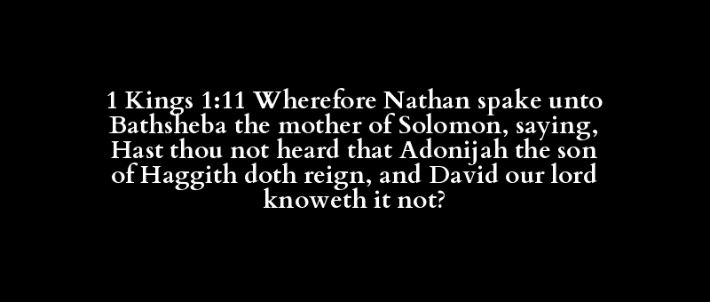 1 Kings 1:11 Wherefore Nathan spake unto Bathsheba the mother of Solomon, saying, Hast thou not heard that Adonijah the son of Haggith doth reign, and David our lord knoweth it not?