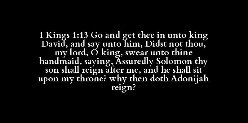 1 Kings 1:13 Go and get thee in unto king David, and say unto him, Didst not thou, my lord, O king, swear unto thine handmaid, saying, Assuredly Solomon thy son shall reign after me, and he shall sit upon my throne? why then doth Adonijah reign?