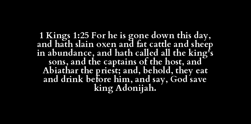 1 Kings 1:25 For he is gone down this day, and hath slain oxen and fat cattle and sheep in abundance, and hath called all the king's sons, and the captains of the host, and Abiathar the priest; and, behold, they eat and drink before him, and say, God save king Adonijah.