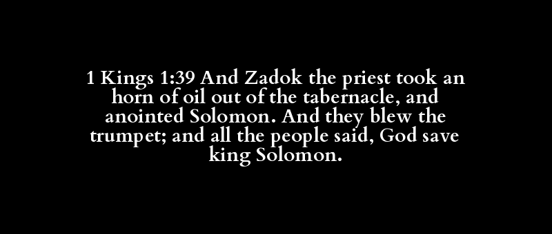 1 Kings 1:39 And Zadok the priest took an horn of oil out of the tabernacle, and anointed Solomon. And they blew the trumpet; and all the people said, God save king Solomon.