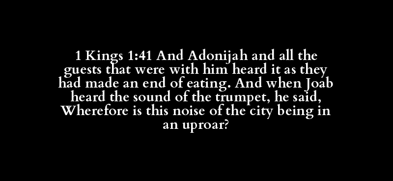 1 Kings 1:41 And Adonijah and all the guests that were with him heard it as they had made an end of eating. And when Joab heard the sound of the trumpet, he said, Wherefore is this noise of the city being in an uproar?