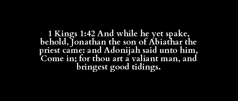 1 Kings 1:42 And while he yet spake, behold, Jonathan the son of Abiathar the priest came: and Adonijah said unto him, Come in; for thou art a valiant man, and bringest good tidings.
