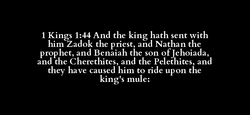 1 Kings 1:44 And the king hath sent with him Zadok the priest, and Nathan the prophet, and Benaiah the son of Jehoiada, and the Cherethites, and the Pelethites, and they have caused him to ride upon the king's mule: