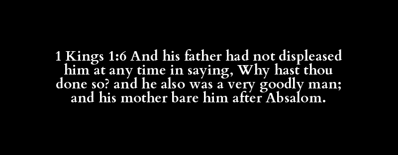 1 Kings 1:6 And his father had not displeased him at any time in saying, Why hast thou done so? and he also was a very goodly man; and his mother bare him after Absalom.