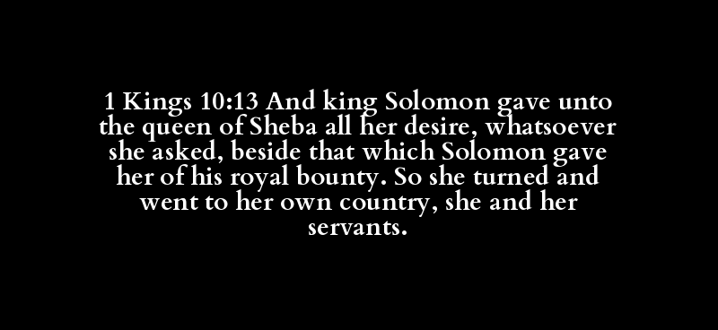 1 Kings 10:13 And king Solomon gave unto the queen of Sheba all her desire, whatsoever she asked, beside that which Solomon gave her of his royal bounty. So she turned and went to her own country, she and her servants.
