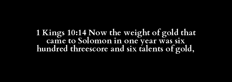 1 Kings 10:14 Now the weight of gold that came to Solomon in one year was six hundred threescore and six talents of gold,