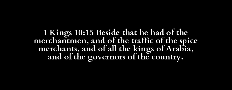 1 Kings 10:15 Beside that he had of the merchantmen, and of the traffic of the spice merchants, and of all the kings of Arabia, and of the governors of the country.