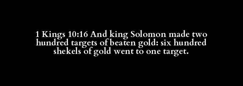 1 Kings 10:16 And king Solomon made two hundred targets of beaten gold: six hundred shekels of gold went to one target.