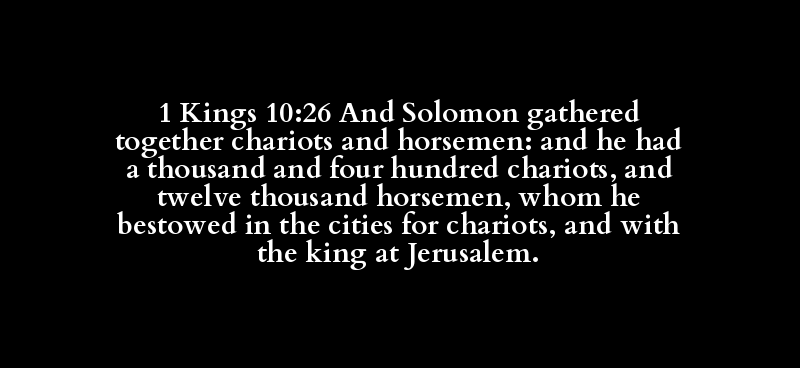 1 Kings 10:26 And Solomon gathered together chariots and horsemen: and he had a thousand and four hundred chariots, and twelve thousand horsemen, whom he bestowed in the cities for chariots, and with the king at Jerusalem.